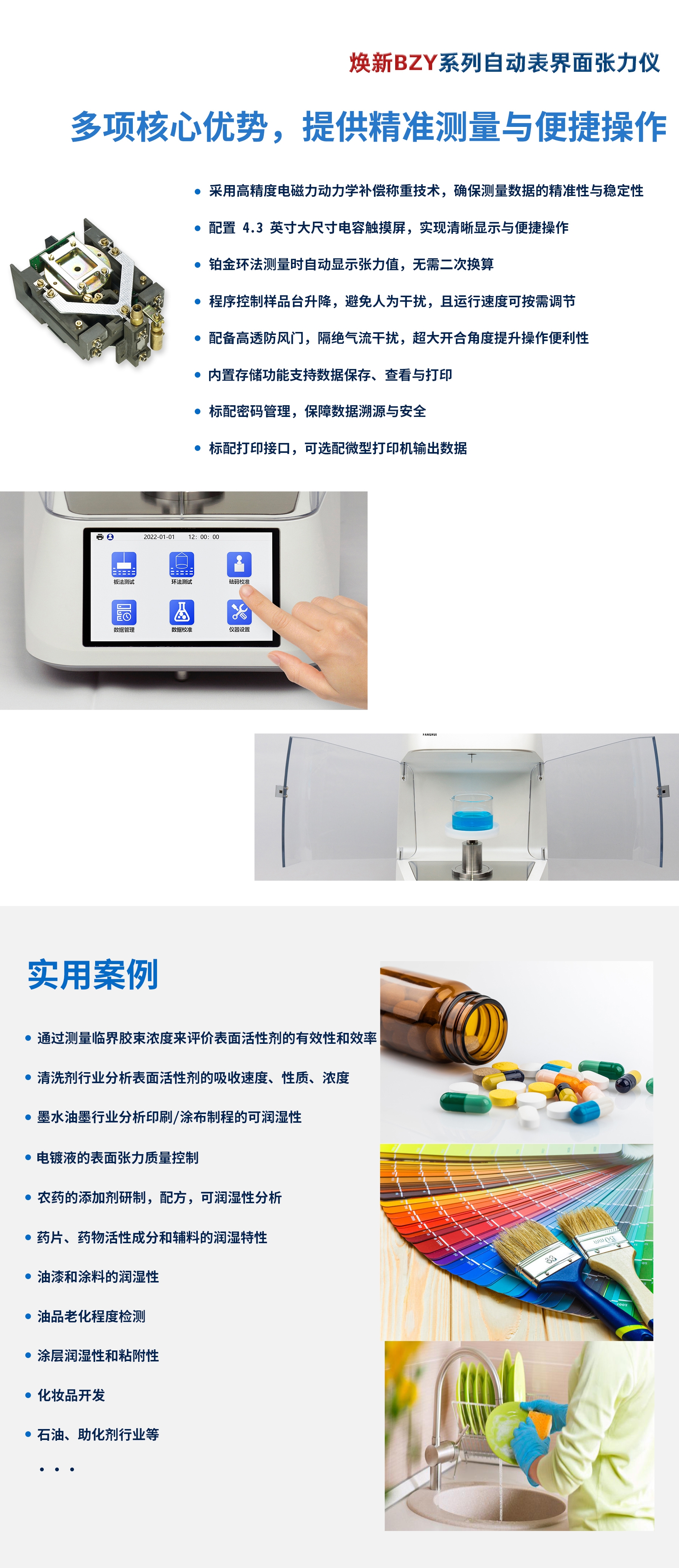 焕新 BZY 系列自动表界面张力仪作为上海方瑞仪器有限公司张力仪家族中的最新型号在外观上迎来了突破性升级 —— 全新设计的外形不仅带来了更具现代感的视觉体验,更在结构布局上兼顾了实用性与美观度,让仪器在实验室或工业现场中都能成为一道亮眼的存在。这款多功能表面张力仪依旧延续了优异性能,配备的大尺寸电容触控面板,让操作更加便捷直观。在核心性能上,它保持着高精度的测量水准,无论是表面张力还是界面张力的测定,都能凭借自动化的运行模式和可靠稳定的性能,为实验数据的准确性保驾护航。此外,仪器搭配高品质配件,支持多种测量模式,使其应用场景极为广泛。无论是表面活性剂分析、润湿性研究等科学研究领域,还是工业生产中的质量控制环节,全新 BZY 系列自动表界面张力仪都能轻松胜任,成为科研人员和工业从业者的得力助手。